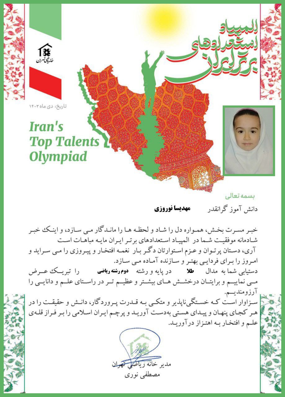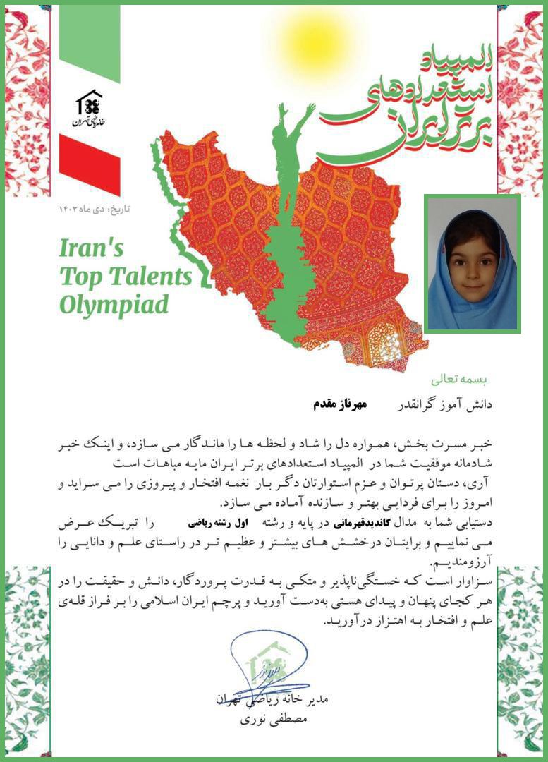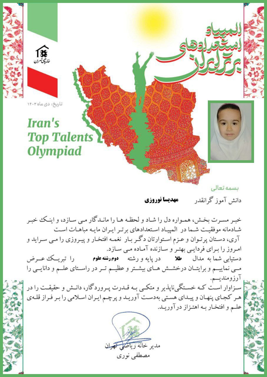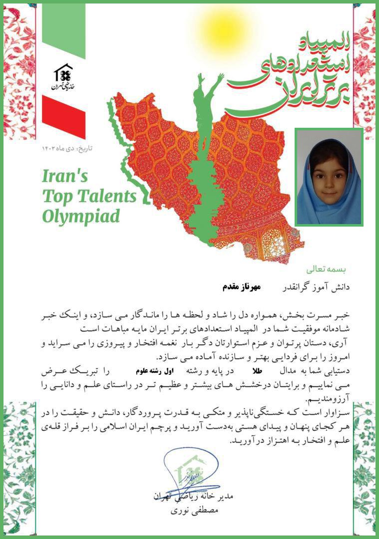 *کسب مدال طلا در رشته علوم و ریاضی المپیاد استعدادهای برتر ایران